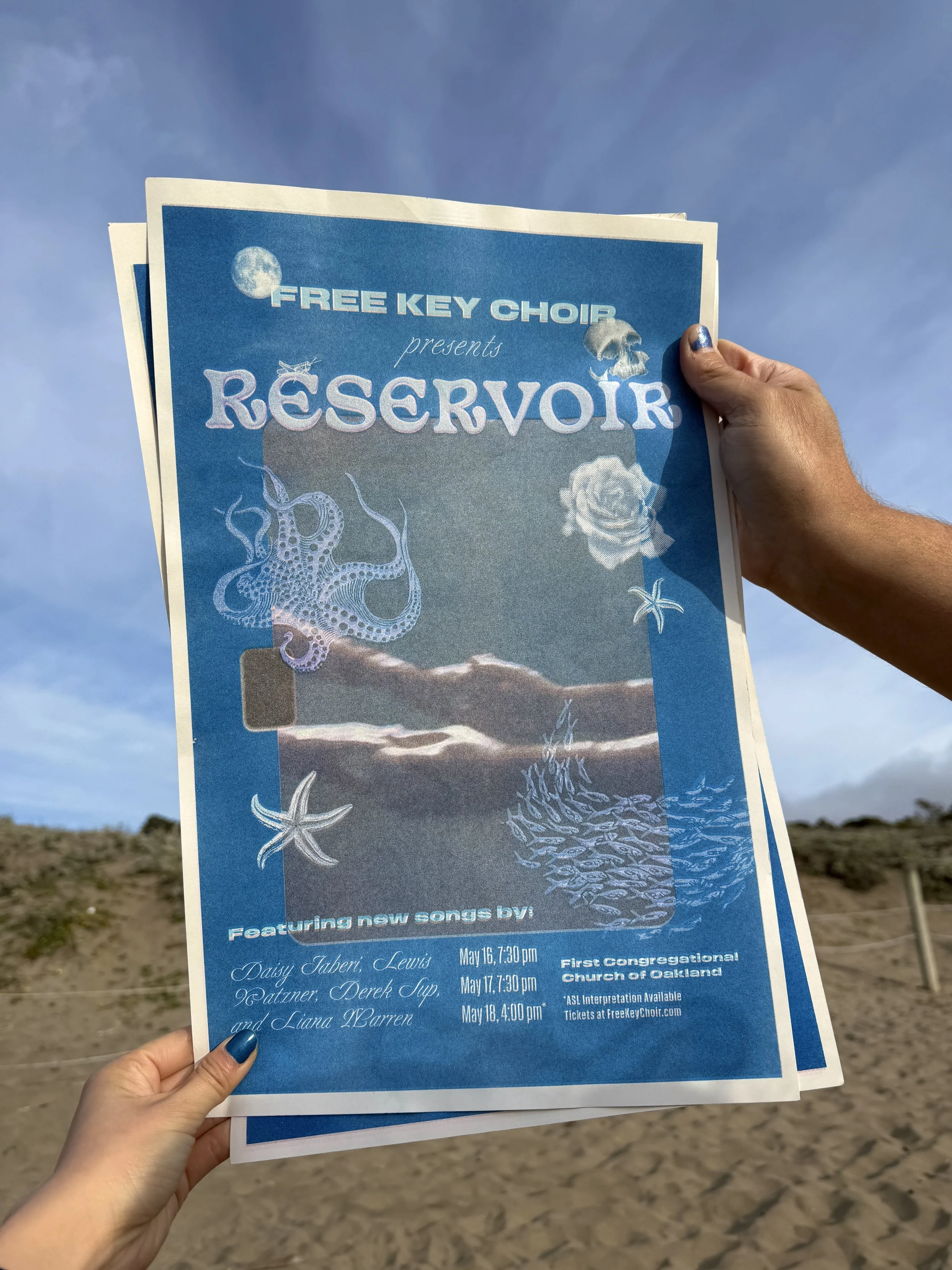 Free Key Choir is an Oakland-based DIY choir that sings original songs written, composed, and arranged by musicians in the choir. As a member, I’ve contributed to the production of each season through name selection, graphic design for social media, and poster printing via risograph. I have also designed art for the release of a few of our singles.